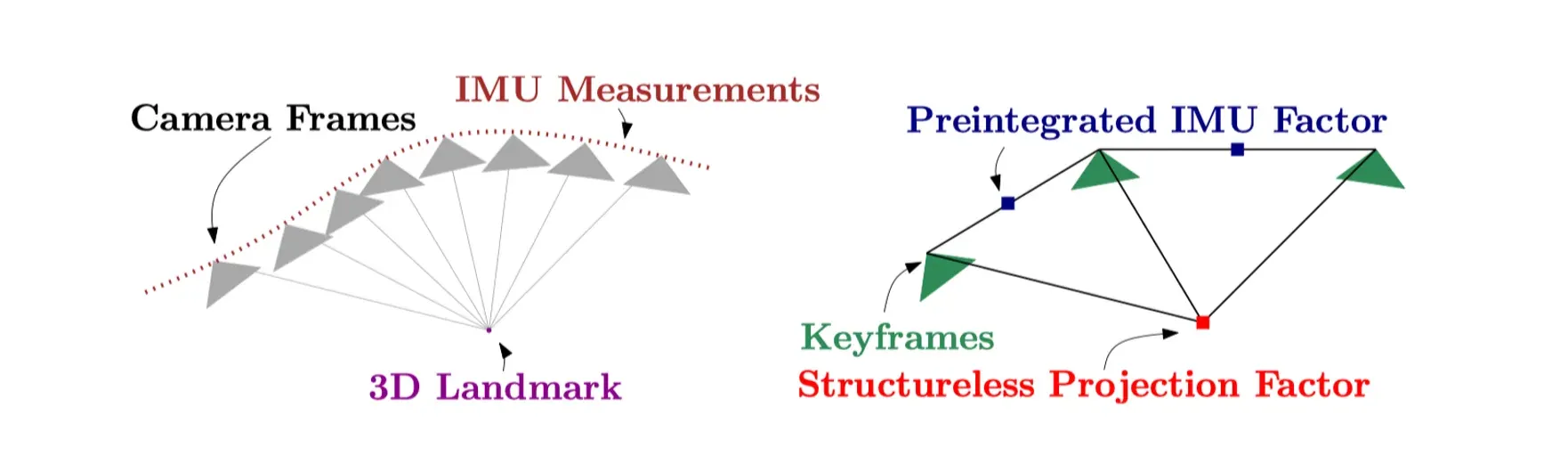 A factor graph is a structure used to represent the relationships between variables in a stochastic model and to find solutions that satisfy all constraints (factors). It is used here to address the Visual-Inertial Odometry (VIO) problem and consists of the following main components